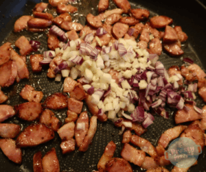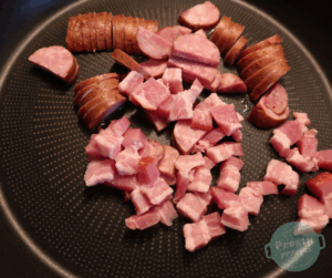 Boczek/kiełbasę pokroić w kostkę, podsmażyć na patelni na odrobinie oleju, gdy się lekko zarumieni dodać cebulę pokrojoną w kostkę – wszystko razem przesmażyć.