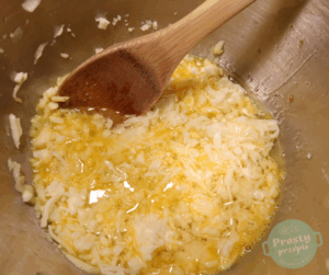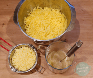Jajka roztrzepać, dodać do nich ser, który wcześniej zetrzeć na tarce o dużych oczkach.
