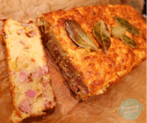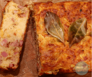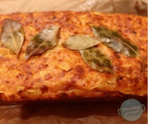 Blaszkę 24 x 28 cm (zmieści się też w tradycyjnej keksówce) natłuścić lub wyłożyć papierem do pieczenia i przełożyć do niej masę, można ułożyć liście laurowe, będzie bardziej aromatyczna.