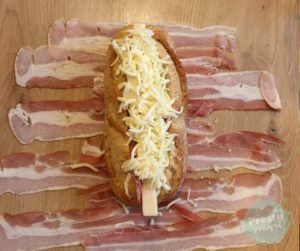 Bagietkę owinąć w mumię plastrami boczku.