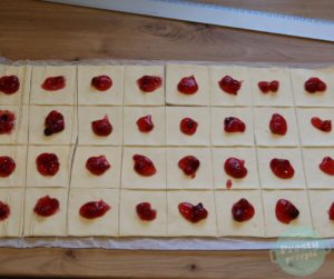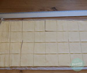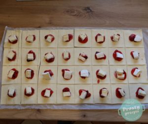 Ciasto francuskie pokroić w kwadraty równej wielkości (moje są wymiarów około 6×6 cm, a nawet nieco mniejsze).