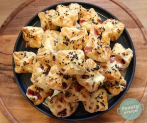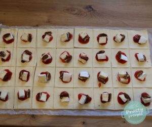 Wielkość przekąski możesz dostosować do swoich upodobań, równie dobrze można ciasto pokroić na większe kwadraty, na każdy dać więcej nadzienia i każdemu chętnemu wyjdzie solidna porcja przystawki.