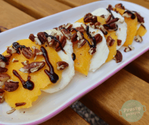 Mozzarellę można zastąpić burratą – położyć kulkę burraty na środku talerza przekroić ją na środku – zrobić gwiazdkę kilkoma cięciami. Z resztą składników postępować j/w.