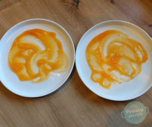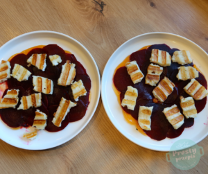 Na każdym z talerzy rozsmarować porcję musu z mango, ułożyć plastry buraka.