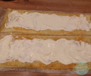 Schłodzone ciasto francuskie rozwinąć i przekroić wzdłuż na dwie równe części.