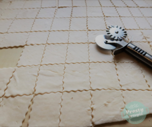 Karbowaną rolką (radełkiem) pociąć ciasto na romby (wielkości około 4×3 cm). Jeśli nie mamy radełka, można użyć noża no pizzy.