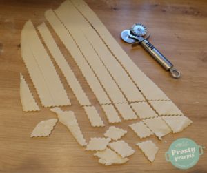 Karbowaną rolką (radełkiem) pociąć ciasto na romby (wielkości około 4×3 cm). Jeśli nie mamy radełka, można użyć noża no pizzy.