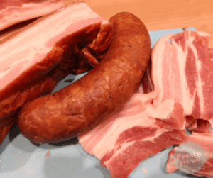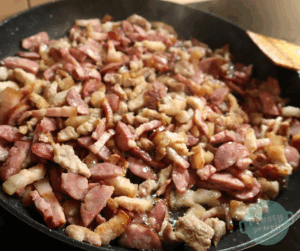 Całość mięsa pokroić na drobniejsze kawałki, przesmażyć na patelni. Najpierw smażyć boczek surowy, później dodać boczek wędzony i kiełbasę.