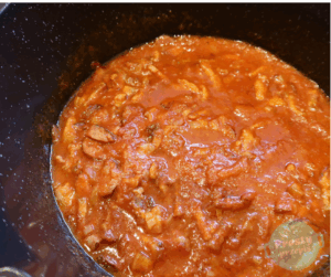Z pomidorów wykroić zdrewniałe środki i sparzyć wrzątkiem, po lekkim ostygnięciu zdjąć skórkę i pokroić w większą kostkę, dodać do mięsa (jeśli używamy pomidorów z puszki, należy wrzucić całą zawartość puszki). Doprawić przyprawami, wymieszać. Smażyć do momentu, aż odparuje woda z pomidorów, a danie zrobi się gęstsze.