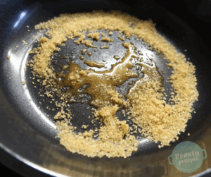 Na suchej patelni skarmelizować cukier (podgrzewać do momentu, aż cukier się roztopi i zacznie nabierać brązowego koloru (w przypadku białego cukru). Wrzucić do fasolki, najpierw się zbryli, ale się później rozpuści.