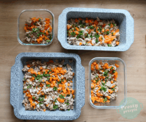Na dno naczyń ułożyć posiekane warzywa i mięso oraz pokrojone ząbki czosnku (jeśli lubicie czosnek, możecie świeży wycisnąć przez praskę i zmieszać z mięsem).