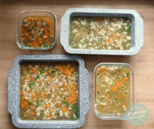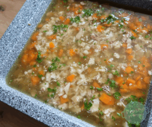 Ugotowaną marchewkę i pietruszkę pokroić w mniejszą kostkę (pietruszkę czasem pomijam). Mięso obrać z kości i posiekać (wszystko można zmiksować w blenderze, ale delikatnie, nie na gładką masę, kawałki mogą być różnej wielkości, w ten sam sposób zmielić obrane mięso razem ze skórą – skórki można też pominąć) – wybór należy do was, ja wybieram opcję krojenia nożem.