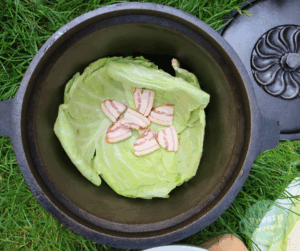 W ten sposób przygotowany kociołek wstawić do przygotowanego wcześniej żaru. Piec przez około 3 godziny przez cały czas utrzymując temperaturę paleniska, ważne żeby kociołek nie stał w ogniu, co jakiś czas sprawdzać, żeby żaru nie zabrakło!