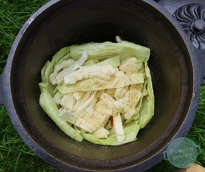 Kociołek wyłożyć liśćmi kapusty, na dno kociołka przed włożeniem liści można położyć odciętą skórkę boczku.