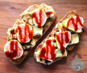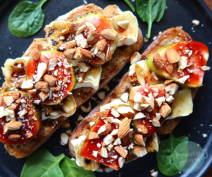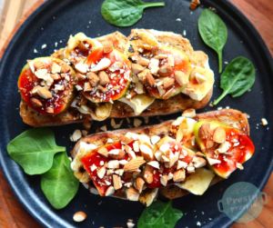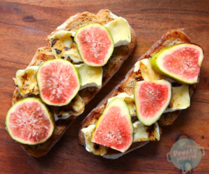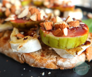 Grzanka z grillowanym camembert, świeżą figą, syropem daktylowym i migdałami