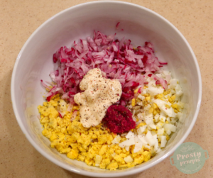 Dodać chrzan oraz majonez i przyprawy. Wymieszać.