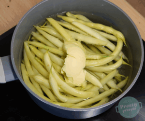 Gdy fasolka zacznie zmieniać kolor, należy dodać łyżkę masła. Dokładnie rozmieszać.