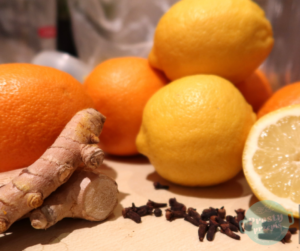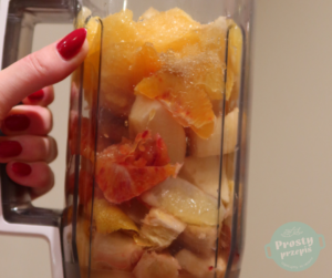 Cytryny i pomarańcze dokładnie wyszorować i sparzyć wrzątkiem. Obieraczką do warzyw obrać skórkę. Po obraniu odkroić białą warstwę. Obrane owoce pokroić na mniejsze kwaki, jeśli się pojawią w nich pestki to wyjąć. Pokrojone cytrusy oraz skórki wrzucić do blendera. Dodać obrany imbir i kurkumę (najlepiej używać rękawiczek, gdyż korzeń kurkumy strasznie farbuje ręce na żółto) też pokrojone na mniejsze kawałki oraz resztę składników: anyż, goździki, cukier i cynamon.