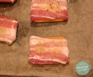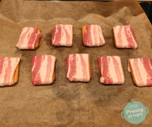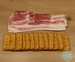 Każdego krakersa osobno owinąć plastrem boczku wokół dłuższego boku. Plastry boczku powinny być bardzo cienkie (ja używam surowo-wędzonego z Biedronki).