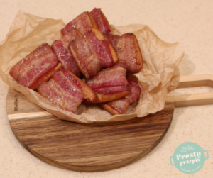 Zapiekać w temperaturze 180ºC w trybie góra/dół przez około 20 minut, a w zasadzie do momentu, aż boczek ładnie zacznie się rumienić, a cukier roztopi się pod wpływem ciepła.