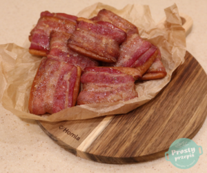 Zapiekać w temperaturze 180ºC w trybie góra/dół przez około 20 minut, a w zasadzie do momentu, aż boczek ładnie zacznie się rumienić, a cukier roztopi się pod wpływem ciepła.