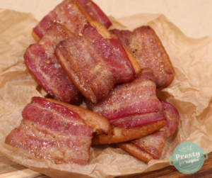 Każdego krakersa osobno owinąć plastrem boczku wokół dłuższego boku. Plastry boczku powinny być bardzo cienkie (ja używam surowo-wędzonego z Biedronki).