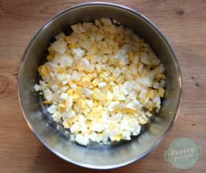 Jajka ugotować na twardo, po wystudzeniu pokroić w małą kosteczkę.