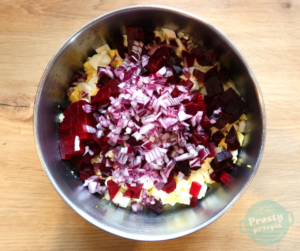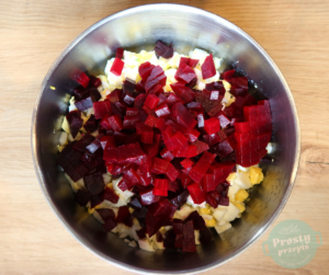 Upieczone lub ugotowane buraki pokroić w kostkę podobnej wielkości co jajko (można niewielką ilość odłożyć, aby później burakiem udekorować babeczki).