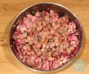 Płaty śledzia również pokroić w mniejszą kostkę (jeśli używamy śledzia solonego, należy go wcześniej wymoczyć np. w mleku, zimne mleko działa szybciej niż woda i sprawia, że śledź będzie bardziej kruchy).
