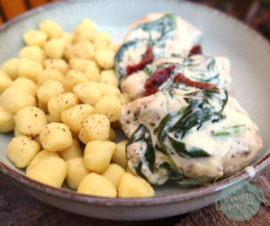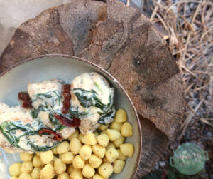 Danie można upiec też w piekarniku w temperaturze 180 stopni w trybie góra/dół przez około 30 minut pod przykryciem. W momencie wrzucania szpinaku, jednocześnie można dodać kluseczki gnocchi które świetnie wchłaniają sos i sprawiają, że każdy kęs jest jeszcze bardziej wyjątkowy.