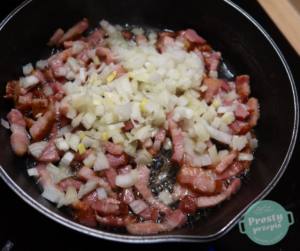 Boczek wędzony pokroić na mniejsze kawałki, przetopić na patelni, gdy zacznie się złocić, dodać do niego posiekaną cebulę i smażyć do momentu, aż cebula się zeszkli – to będzie nasza okrasa do zupy.