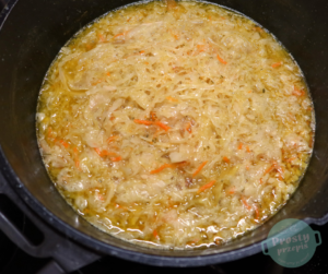 Do garnka dodać 500 gramów dobrej jakości kiszonej kapusty razem z sokiem. Kapusty nie odciskamy, nie płuczemy i nie siekamy na mniejsze kawałki.