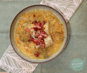 Jeśli macie ochotę na więcej aromatycznego mięsa w zupie, to podczas gotowania się kapusty można dorzucić do niej żeberka lub golonkę pokrojone na mniejsze kawałki.