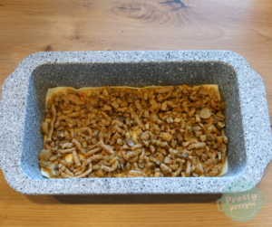 Na makaron ułożyć warstwę farszu z mięsa i pieczarek.