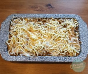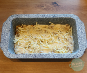 Układać tak samo następne warstwy. Warstwa kończąca to sos beszamelowy i żółty ser.