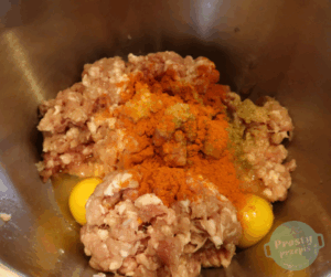 Do mięsa mielonego dodać wszystkie przyprawy, jajka, wycisnąć czosnek i posiekaną na drobno cebulę (cebulę można tez zmielić w blenderze). Wszystko dokładnie wymieszać.