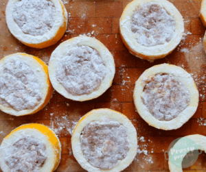 Środek każdego plastra cukinii wydrążyć kieliszkiem lub małą szklaneczką. Ta część będzie bezużyteczna, posiada pestki, więc ją po prostu wyrzucamy.