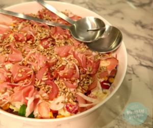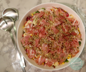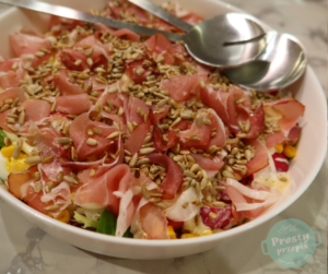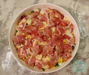 Miks sałat z chrupiącymi warzywami, sosem majonezowym i szynką szwarcwaldzką