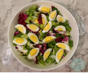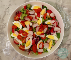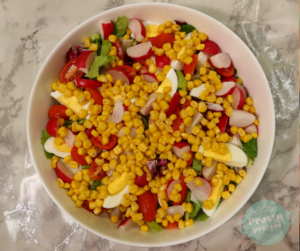 W większej misce rozłożyć sałatę. Dodać ugotowane jajka na twardo pokrojone w ósemki, pomidorki przekrojone na połowę wzdłuż, rzodkiewki pokrojone w ćwiartki, odsączoną kukurydzę.
