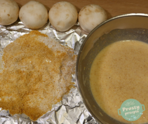 Dodatkowo do panierowania zmieszać w równych proporcjach mąkę pszenną z mąką kukurydzianą (ilość dodanej mąki zależy od ilości pieczarek).