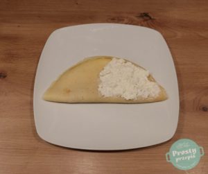 Naleśniki składać w kopertę. Cienką warstwę sera wyłożyć na naleśnika, a następnie złożyć go na połowę, posmarować kolejną porcję sera i złożyć jeszcze raz na pół.