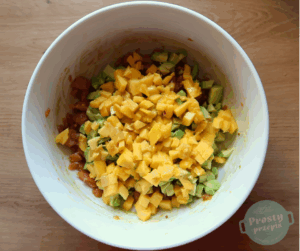 Dodać cebulę drobno posiekaną oraz awokado i mango pokrojone w drobna kostkę.