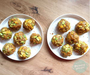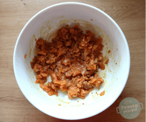 Wszystkie składniki delikatnie połączyć. W razie potrzeby doprawić do smaku sosem sojowym. Można wstawić na jakiś czas do lodówki, aby masa bardziej zastygła, dzięki czemu będzie wygodniej robić kulki.