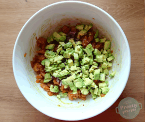 Dodać cebulę drobno posiekaną oraz awokado i mango pokrojone w drobna kostkę.