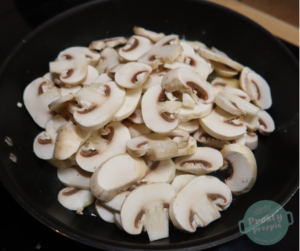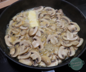 Gdy kurczak będzie się grillował, pieczarki pokroić w cienkie plastry, usmażyć na maśle. Gdy woda z pieczarek wyparuje, wlać śmietankę, dodać sól i biały pieprz. Chwilę gotować, dodać szczyptę mąki, aby sos nieco zgęstniał,