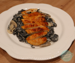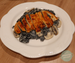 Pierś grillowana podana na makaronie w sosie śmietanowo-pieczarkowym
