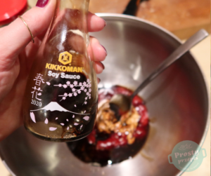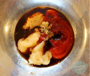 Keczup, miód, musztardę, wyciśnięty czosnek, tabasco, sos sojowy i przyprawy dokładnie wymieszać.