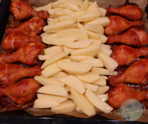 Możemy również zrobić kurczaka z ziemniakami. Wówczas na wyścieloną papierem do pieczenia blachę wyłożyć pałki kurczaka, tworząc na środku przestrzeń na ziemniaki.
