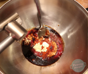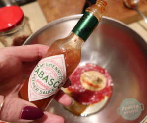 Keczup, miód, musztardę, wyciśnięty czosnek, tabasco, sos sojowy i przyprawy dokładnie wymieszać.