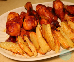 Gdy kurczaki ładnie się zapieką, można już je wyjąć z piekarnika, a ziemniaki rozsunąć na całą blaszkę i dopiec, aby się ładnie zarumieniły w temperaturze 200ºC przez około 10 minut. Jeśli macie w piekarniku funkcję „grill”, to najlepiej jej użyć, wówczas ziemniaki zapieką się dosłownie w kilka minut.